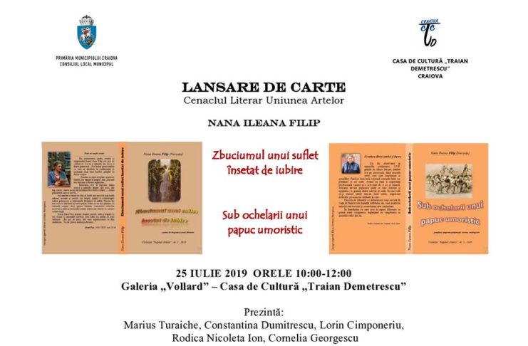 Casa de Cultură ”Traian Demetrescu” vă invită joi 25 iulie 2019, ora 10.00, la Galeria „Vollard” la lansarea volumelor „Zbuciumul unui suflet însetat de iubire” – poeme de dragoste – și „Sub ochelarii unui papuc umoristic” – epigrame polițienești, catrene, madrigaluri – ale autoarei Nana Ileana Filip. Prozatoare, poetă, eseistă și epigramistă, autoare a 38 de volume, Nana Ileana Filip, „prin însăși generozitatea cu care se deschide în confesiunile ei șochiază, chiar dacă dizolvă <<plăgile>> în fluide ironice”. Este președinte al Cenaclului “Regatul Artelor”, fost prim-vicepreședinte al Cenaclului „Literatura la…