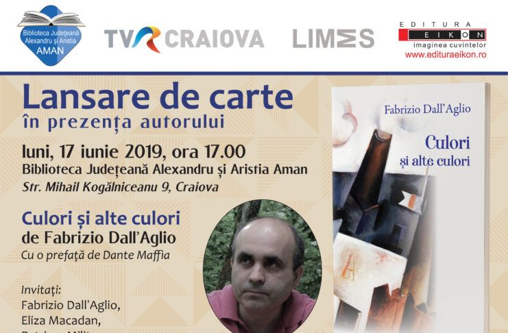 Biblioteca Județeană „Alexandru și Aristia Aman” găzduiește luni, 17 iunie 2019, începând cu ora 17:00, în sala „Acad. Dinu C. Giurescu”, lansarea volumului de poezie „Culori și alte culori” (cu titlul original „Colori e altri colori”), de Fabrizio Dall’Aglio. Evenimentul se desfășoară la inițiativa Editurii Eikon din București și a Asociației Culturale Limes în parteneriat cu Biblioteca Județeană „Alexandru și Aristia Aman” și Televiziunea Română – Studioul Craiova. Alături de Fabrizio Dall’Aglio, care va dialoga cu publicul și va acorda autografe, în cadrul evenimentului vor lua cuvântul Petrișor Militaru și…
