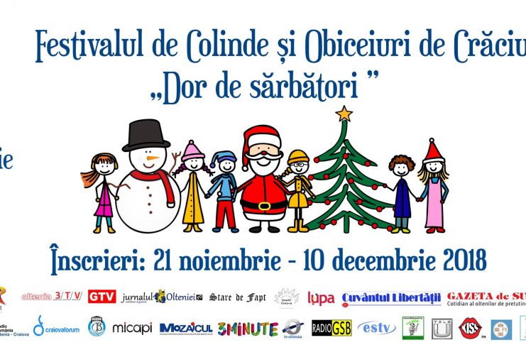 Casa de Cultură „Traian Demetrescu” organizează Festivalul – Concurs de colinde şi obiceiuri de Crăciun „Dor de sărbători”, care se va desfăşura la Aula Buia a Facultăţii de Agronomie pe data de 14 decembrie 2018, începând cu ora 15:00. Festivalul se adresează grupurilor şcolare de colindători din instituţiile de învăţământ din judeţul Dolj, având următoarele categorii: SECŢIUNEA I – grupuri de colindători din învăţământul primar; SECŢIUNEA a II-a – grupuri de colindători din învăţământul gimnazial; SECTIUNEA a III-a – grupuri de colindători din învăţământul liceal. Participanţii înscrişi în concurs cu…