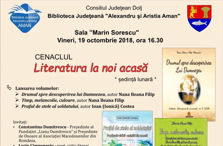 Biblioteca Județeană „Alexandru și Aristia Aman” găzduiește vineri, 19 octombrie 2018, începând cu ora 16:30, în sala „Marin Sorescu”, ședința lunară a Cenaclului ,,Literatura la noi acasă”. Invitați: – Constantina Dumitrescu – Președinte al Fundației ,,Liana Dumitrescu” și Președinte de Onoare al Asociației Macedonenilor din România; – Lorin Cimponeriu – poet, critic literar, promotor de imagine al cenaclului; – Ion Rodica- scriitor, epigramist; – Adrian Sora- kinetoterapeut, blogger și fotograf; – Cristina Bălășoiu – președinte fondator al cenaclului. În cadrul acțiunii vor fi lansate volumele: „Drumul spre descoperirea lui Dumnezeu”,…