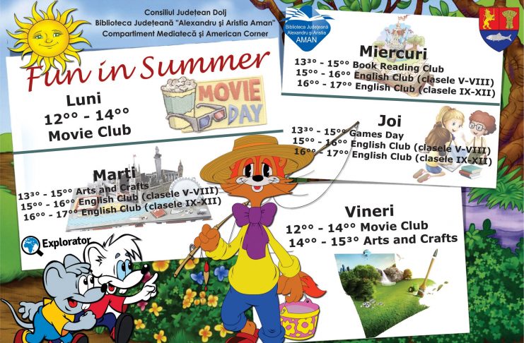 Biblioteca Județeană „Alexandru și Aristia Aman” demarează luni, 2 iulie, cursurile și activitățile proiectului educativ „Fun in Summer”. Activitățile de proiect se desfășoară gratuit și se adresează elevilor din ciclurile primar, gimnazial și liceal, fiind organizate de bibliotecari și voluntarii Bibliotecii Județene „Alexandru și Aristia Aman”. Cursurile și atelierele „Arts Crafts”, „English Club”, „Book Reading Club”, „Games Day” și „Movie Club” vor fi susținute de mai mulți voluntari proveniți de la Universitatea din Craiova: Andreea-Daniela Popa, Sabrina-Maria Catrina, Alberta-Andraa Țiu, Mihaela Ștefan, Ana-Maria Buzatu, Armand-Antonio Pascu, Sonia Seres, Elisabet-Mihaela Toma,…