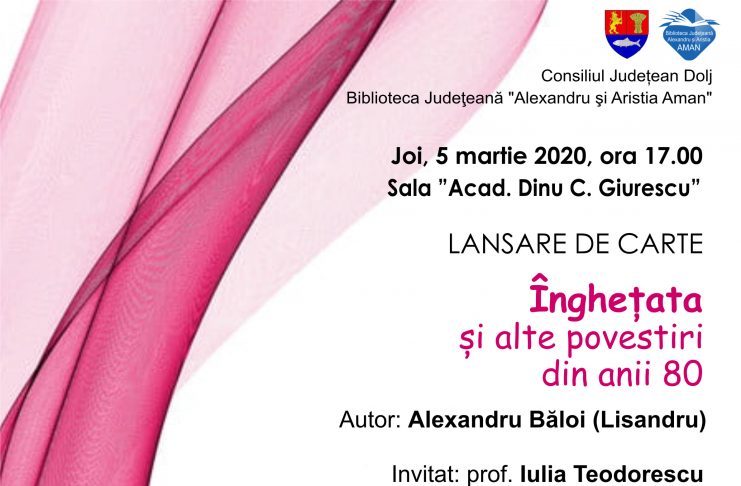 Biblioteca Județeană „Alexandru și Aristia Aman” găzduiește joi, 5 martie 2020, începând cu ora 17:00, în sala „Acad. Dinu C. Giurescu”, lansarea volumului „Înghețata și alte povestiri din anii 80”, autor Alexandru Băloi (Lisandru). La eveniment și-a anunțat participarea Iulia Teodorescu. „La 17 iunie 1969 apare pe lume, prin milă Divină, în familia lui Ion Băloi și Elena, zisă Lineta, fiul cel mic Alexandru Băloi, zis Lisandru. Scriitorul este al patrulea copil din familie, după frații săi: Trifu, Ionică și Cleopatra (Măria). Chiar ei sunt protagoniști ai diverselor întâmplări descrise…