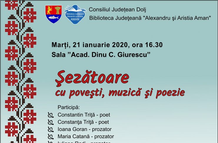 Biblioteca Județeană „Alexandru și Aristia Aman” găzduiește marți, 21 ianuarie 2020, în sala „Acad. Dinu C. Giurescu”, începând cu ora 16.30, evenimentul intitulat „Șezătoare cu povești, muzică și poezie”. Evenimentul este coordonat de consultanții Zenovia Zamfir, Rodica Rozalia Jianu, Maria Găman. Participă Constantin Triţă – poet, Constanţa Triţă – poet, Ioana Goran – prozator, Maria Catană – prozator, Iuliana Radi – prozator, Tatiana Mărcoianu – interpretă muzică popular și Grupul „Oltenia coase iie”. „Ne dorim să depănăm împreună firul poveştilor de altădată, la gura sobei când ziua se îngână cu…