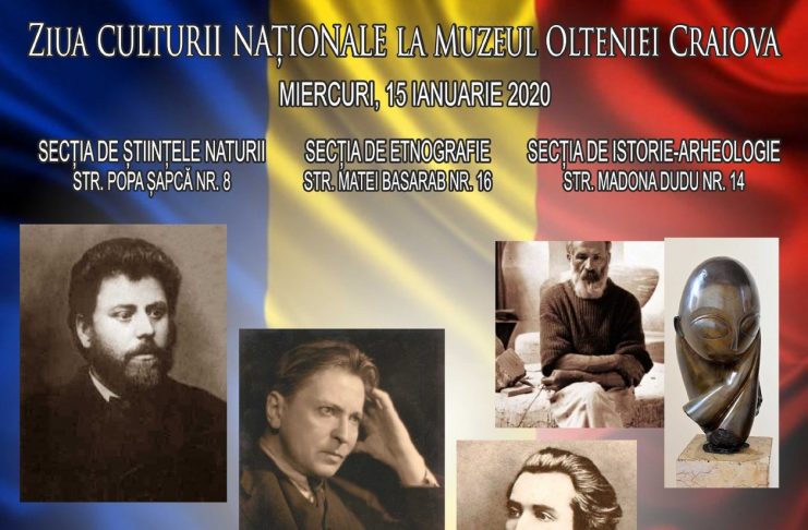 Miercuri, 15 ianuarie 2020, cu ocazia Zilei Culturii Naționale, Muzeul Olteniei Craiova va oferi tururi ghidate și acces gratuit vizitatorilor la toate secțiile expoziționale din structura sa organizatorică, respectiv: Secția de Istorie-Arheologie (str. Madona Dudu nr. 14), Secția de Etnografie – Casa Băniei (str. Matei Basarab nr. 16) și Secția de Științele Naturii (str. Popa Șapcă nr. 8), în intervalul orar 09.00-17.00. De asemenea, începând cu ora 14.30, în spațiul interactiv al Muzeului Olteniei, cu sprijinul financiar al Consiliului Județean Dolj, se va organiza atelierul de creație “Educație prin cultură”…