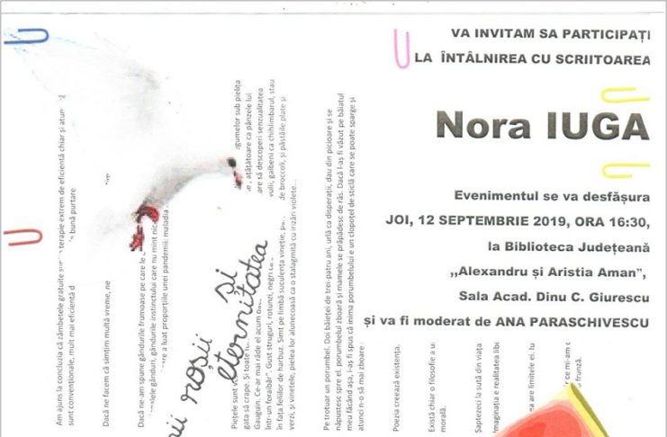 Biblioteca Județeană „Alexandru și Aristia Aman” găzduiește joi, 12 septembrie 2019, începând cu ora 16:30, în sala „Acad. Dinu C. Giurescu”, întâlnirea cu poeta, romanciera și traducătoarea Nora Iuga. Evenimentul se desfășoară sub titlul generic „Poezia, pepenii roșii și eternitatea”, și va fi moderat de Ana Daniela Paraschivescu. La cei 88 de ani, Nora Iuga este depozitara unor experiențe și episoade literare care abundă în luciditate și expresivitate. Opera domniei sale va fi prefațată de Ana Daniela Paraschivescu, organizatorul evenimentului. Nora Iuga va susține o scurtă expunere, va lectura din…