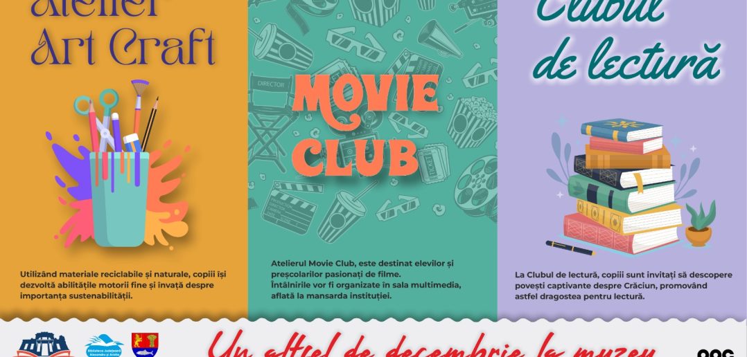 Cel de-al doilea atelier din seria intitulată „Un altfel de decembrie la muzeu”, Movie Club, este destinat elevilor și preșcolarilor pasionați de filme. Întâlnirile vor fi organizate în sala multimedia, aflată la mansarda instituției.