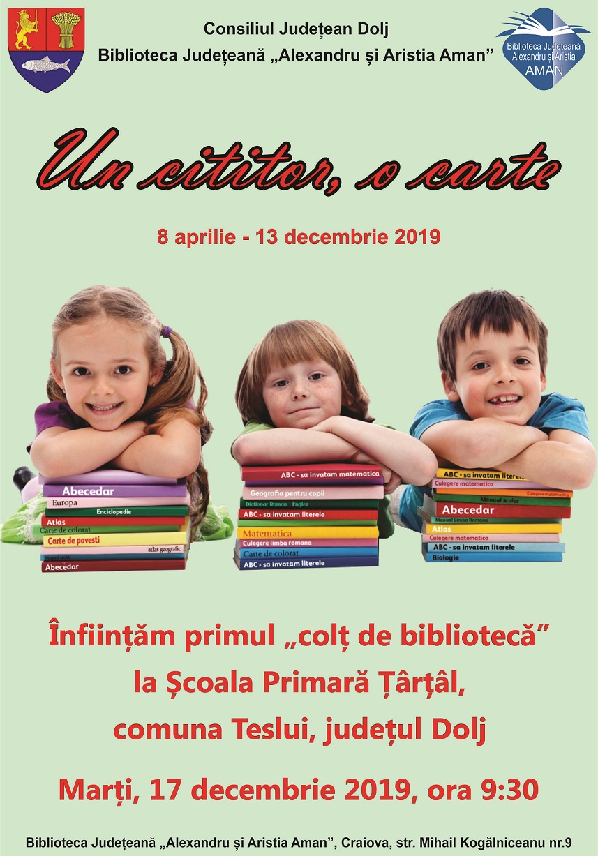 Biblioteca Județeană „Alexandru și Aristia Aman” înființează marți, 17 decembrie 2019, în cadrul proiectului „Un cititor, o carte”, primul „colț de bibliotecă”, la Școala Primară din Țârțăl.
