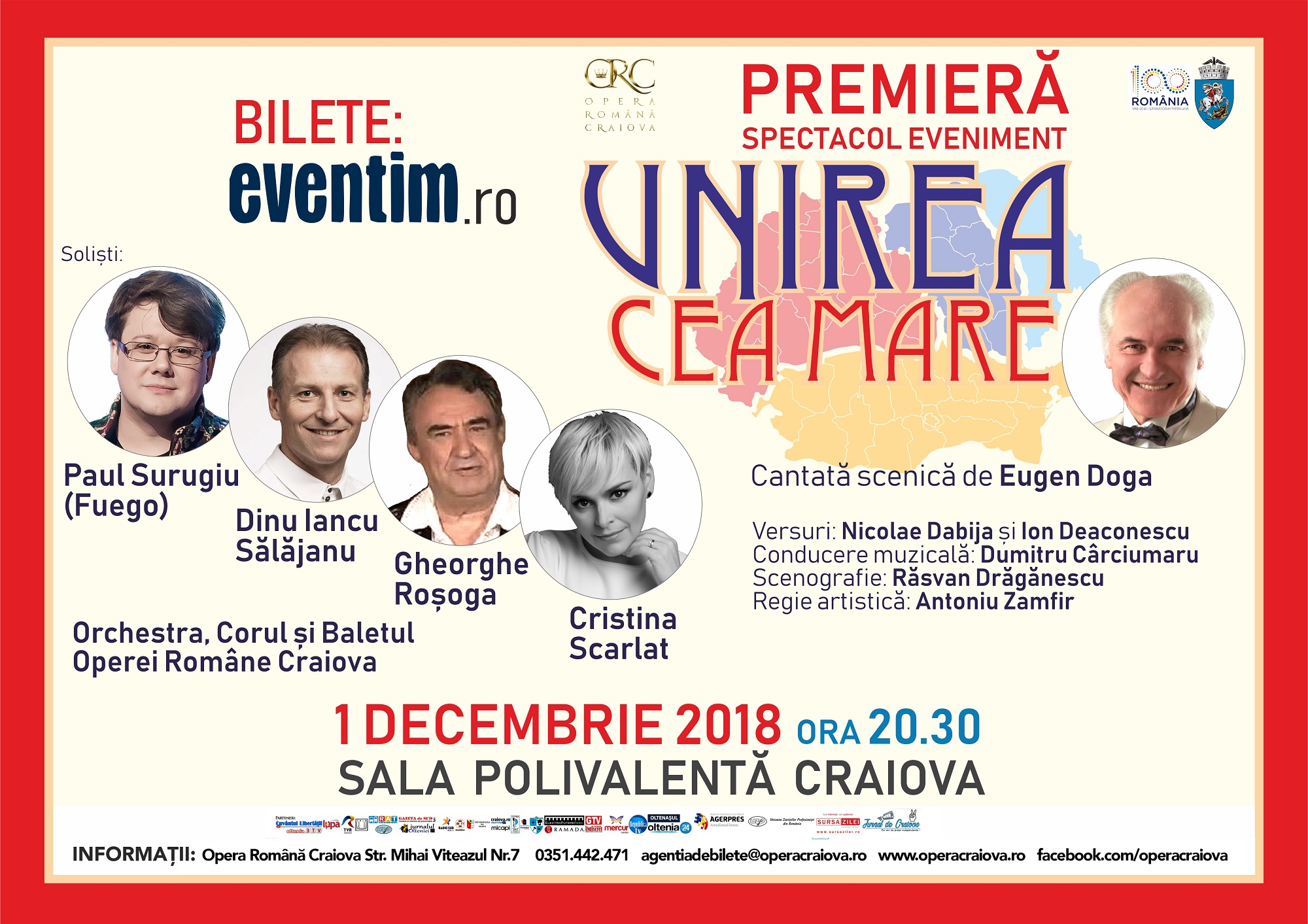Paul Surugiu (Fuego), Dinu Iancu Sălăjanu, Gheorghe Roșoga și Cristina Scarlat sunt invitații spectacolului extraordinar „Unirea cea Mare”, de Eugen Doga, eveniment al Operei Române Craiova cu prilejul Centenarului Marii Uniri, pe 1 decembrie 2018, la Sala Polivalentă din Craiova. Spectacolul care reunește peste 100 de artiști, Orchestra, Corul și Baletul Operei Române Craiova, este realizat cu sprijinul Primăriei Municipiului Craiova și al Consiliului Local Craiova.