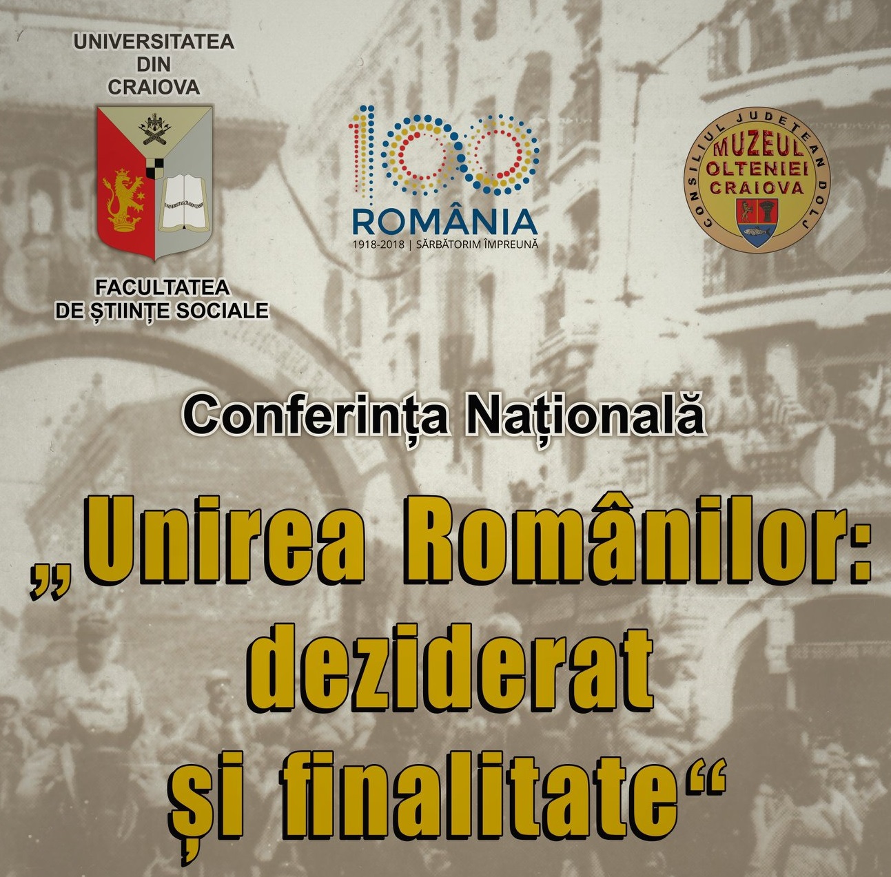 Facultatea de Ştiinţe Sociale a Universităţii din Craiova în parteneriat cu Muzeul Olteniei Craiova şi Societatea de Ştiinţe Istorice din România organizează, cu prilejul Centenarului, în perioada 12-14 noiembrie 2018, Conferinţa Naţională intitulată Unirea românilor: deziderat şi finalitate.