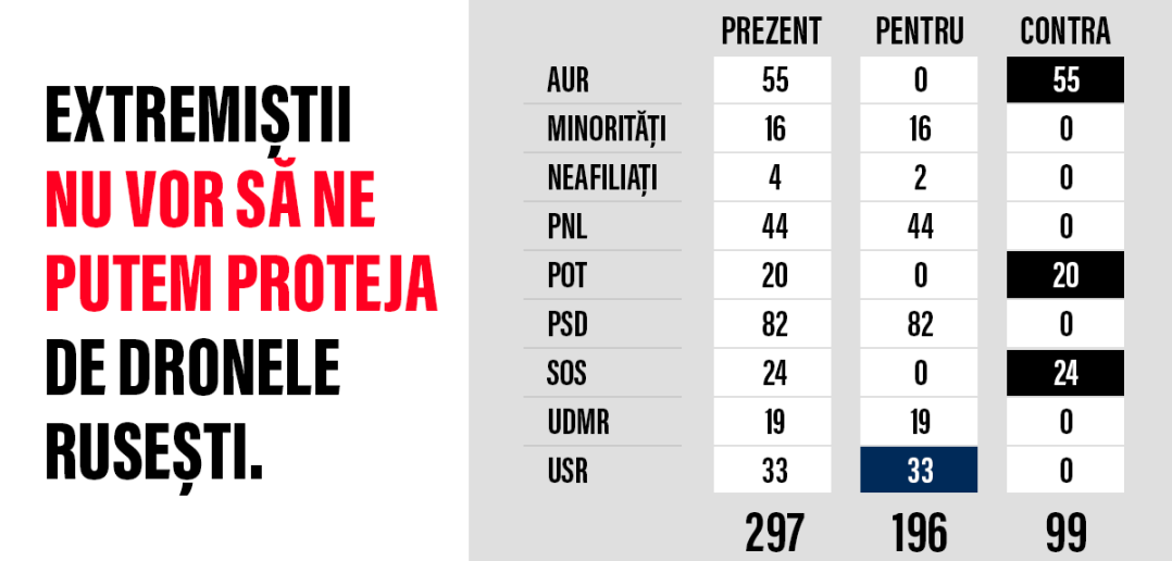 „În timp ce noi luptăm pentru securitatea noastră, a tuturor, partidele izolaționiste AUR, SOS și POT încearcă să ne țină vulnerabili, spunând minciuni și blocând orice măsură de apărare. Este incredibil cum cei care vorbesc despre patriotism sunt primii care ne-ar lăsa fără apărare în fața Rusiei”, mai precizează sursa citată.