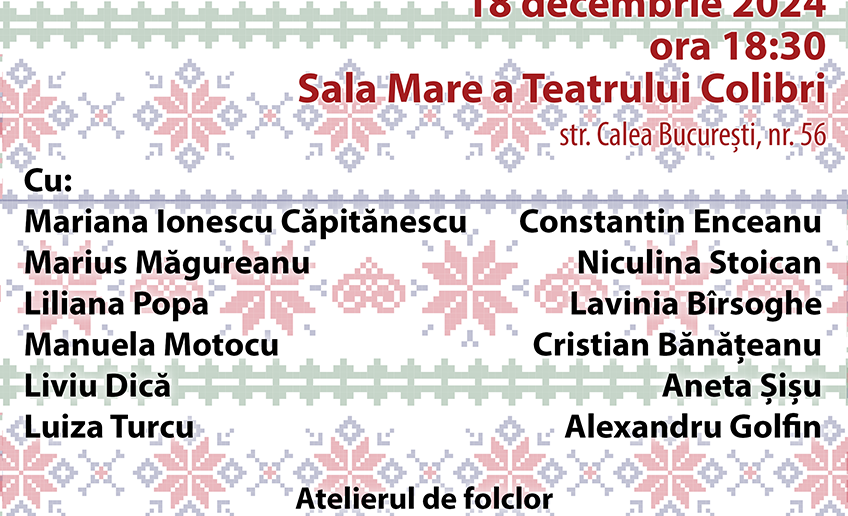 Teatrul pentru copii și tineret Colibri – Secția Folclor „Maria Tănase“ prezintă miercuri, 18 decembrie 2024, ora 18:30, spectacolul „Vă colindăm de Crăciun“.