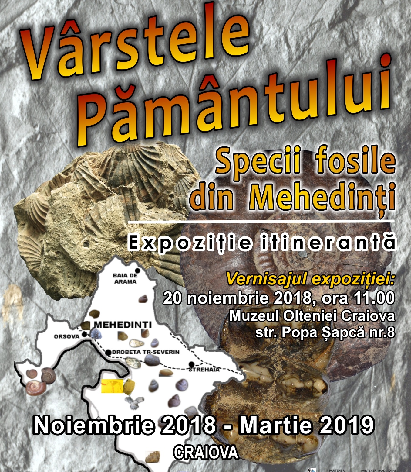 Secția de Științele Naturii a Muzeului Olteniei Craiova în parteneriat cu Muzeul Regiunii Porților de Fier – Drobeta Turnu Severin vernisează, marți, ora 11.00, la sediul său din str. Popa Șapcă nr. 8, expoziția itinerantă “Vârstele Pământului – Specii de fosile din Mehedinți”.