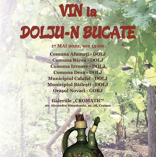 Consiliul Județean Dolj și Centrul Judeţean pentru Conservarea şi Promovarea Culturii Tradiţionale Dolj vă invită marți, 17 mai 2022, ora 13:00, la Galeriile „Cromatic“ ale instituției, la evenimentul „VIN la Dolju-n bucate“, alături de reprezentanți ai Facultăților de Litere și Horticultură din cadrul Universității din Craiova, ai localităților doljene: Afumați, Bârca, Izvoare, Calafat, Băilești, Desa, precum și ai Stânei Ștefanu din județul Gorj.