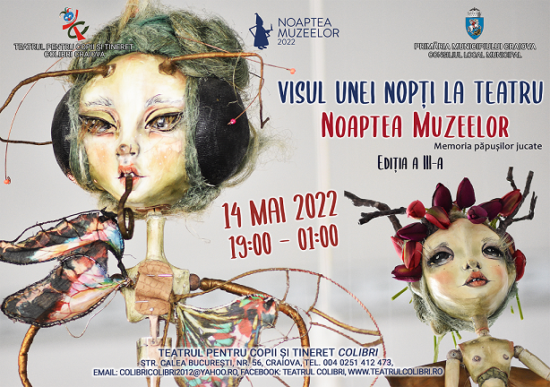 Teatrul pentru copii și tineret Colibri Craiova ne provoacă să trăim împreună „Visul unei nopți la teatru“, sâmbătă, 14 mai 2022, între orele 19:00 – 01:00, în cadrul celei de-a treia ediții a evenimentului Noaptea Muzeelor – Memoria păpușilor jucate. Accesul este gratuit.