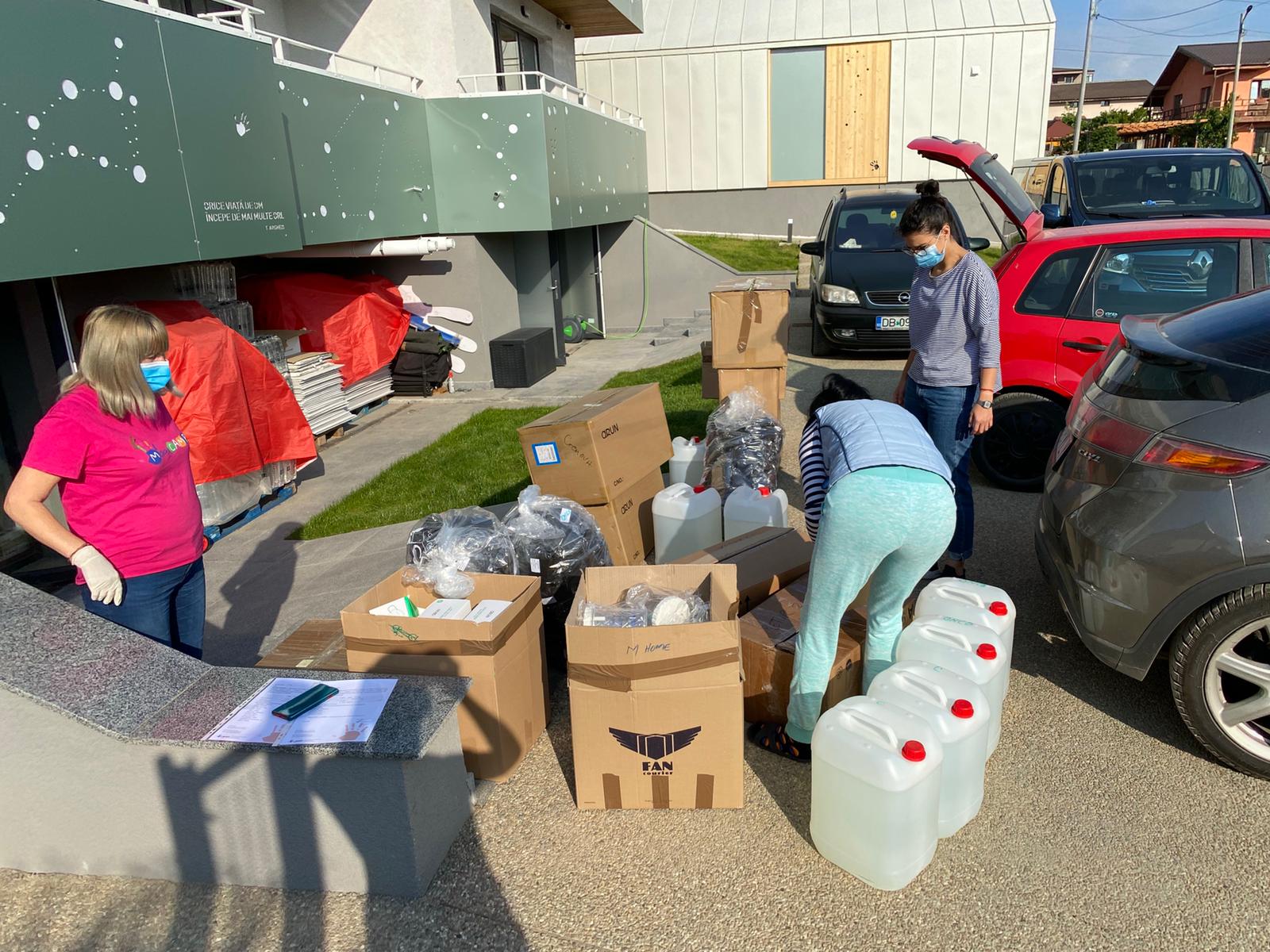 Cele 788 de donații s-au transformat acum în 112 litri de dezinfectant, 150 de combinezoane de protecție, 30 de catetere și vase colectoare, plus viziere, măști, bonete și botoși de protecție (valoarea totală a celui de-al doilea transport = 60784 lei).