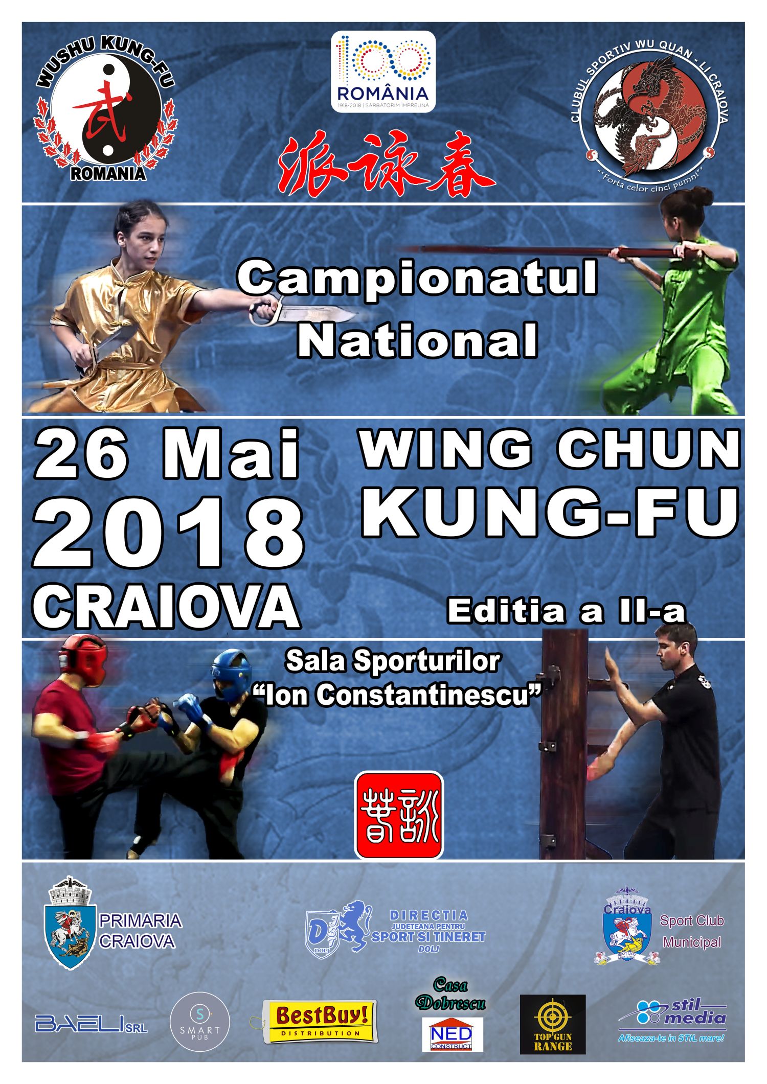 Campionatul Național de Yong Chun Quan (Wing Chun – Boxul Frumoasei Primăveri), ediția aII-a, care se va desfașura SALA MUNICIPALĂ A SPORTURILOR “ION CONSTANTINESCU” din CRAIOVA, unde vor fi prezente cluburi sportive din Baia Mare, București, Buzău, Craiova, Pitești, și Sibiu și peste 100 de sportivi care vor participa la demonstratii de kung-fu și la competiția de luptă în sistem de full-contact. Vor fi prezeți și sportivii craioveni membri ai lotului național de Wushu care în 2017 au fost medaliați la mondiale și europene. La ceremonia de acordare a diplomelor de excelență pentru sportivii de înaltă performanță ai Craiovei vor fi prezenți oficiali ai Primăriei municipiului Craiova, Direcției județene pentru sport și tineret și ai Federației Române de Arte Marțiale.