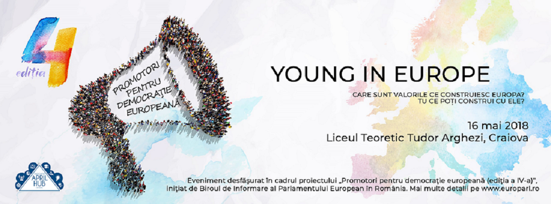 Asociația April Hub Craiova organizează în parteneriat cu Liceul Teoretic Tudor Arghezi activitatea non-formală Young In Europe, miercuri, 16 mai 2018. 30 de elevi vor descoperi valorile ce construiesc Europa, dar și principiile democrației, în prima parte a workshopului. A doua parte a workshopului are la bază munca în echipă, provocarea lor va fi să construiască un turn doar din hârtie și scoci, un turn pe care apoi vor înșira valorile europene.