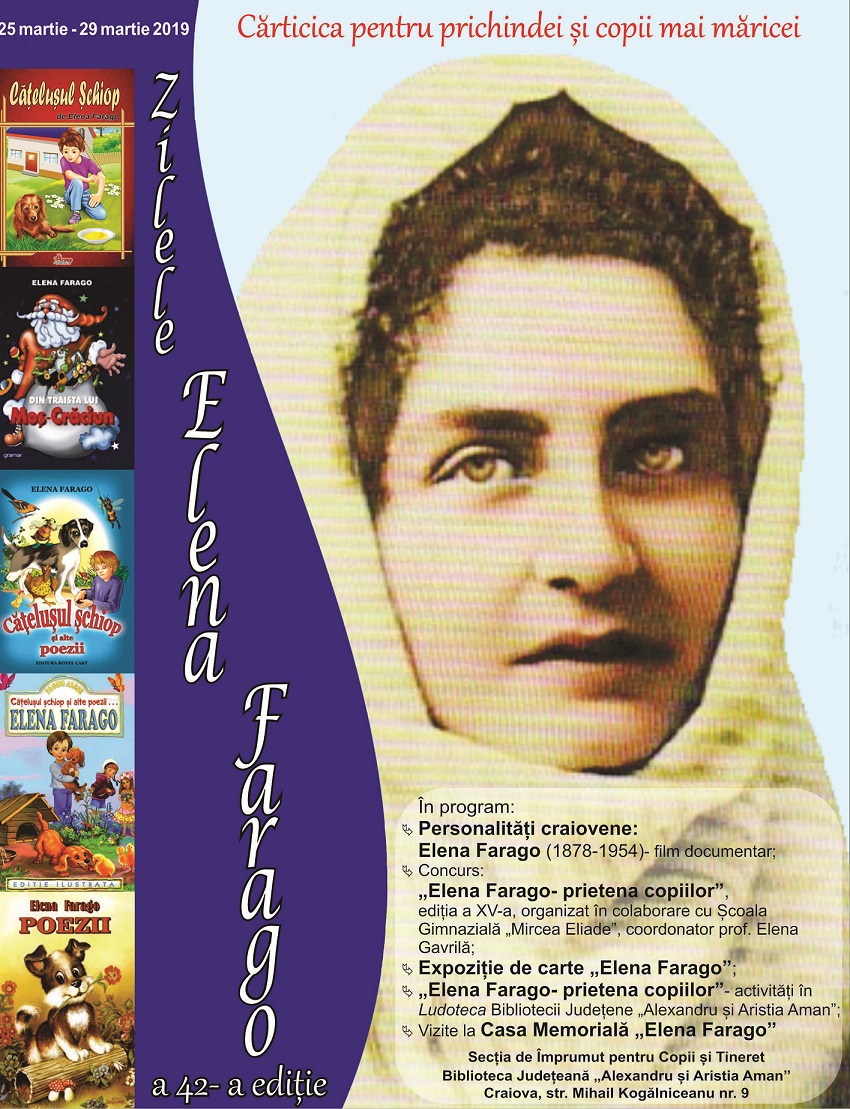 Opera Elenei Farago va fi pusă în valoare atât printr-o expoziţie de carte, prin diverse recitaluri prezentate de elevi, dar și prin vizionarea filmului documentar „Personalități craiovene: Elena Farago (1878 – 1954)”. De asemenea, vineri, 29 martie, Biblioteca Județeană „Alexandru și Aristia Aman” găzduiește cea de-a XV-a ediție a concursului Elena Farago – prietena copiilor. Manifestarea este organizată în colaborare cu Școala Gimnazială nr. 22 „Mircea Eliade”, sub coordonarea profesoarei Elena Gavrilă. Toate acțiunile manifestării se desfășoară în Ludoteca Bibliotecii Județene „Alexandru și Aristia Aman”.