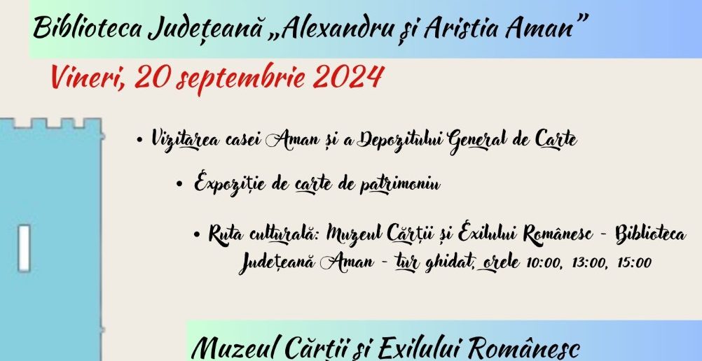 – Ruta culturală Muzeul Cărții și Exilului Românesc- Biblioteca Județeană „Alexandru și Aristia Aman”- tur ghidat, orele 10.00, 13.00, 15.00;