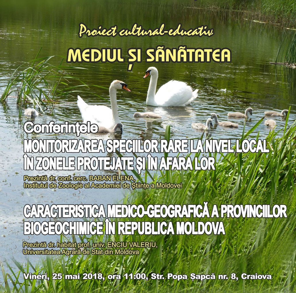 În acest context, în cadrul Proiectului cultural – educativ Mediul şi Sănătatea se înscriu cele două expuneri Monitorizarea speciilor rare la nivel local – în zonele protejate și în afara lor (prezintă Dr. Elena Baban, cercetător ştiinţific în cadrul Institutului de Zoologie al Academiei de Științe a Moldovei) și Caracteristica medico-geografică a provinciilor biogeochimice în Republica Moldova (prezintă Dr. habilitat Valeriu Enciu, profesor universitar în cadrul Universității Agrare de Stat din Republica Moldova).