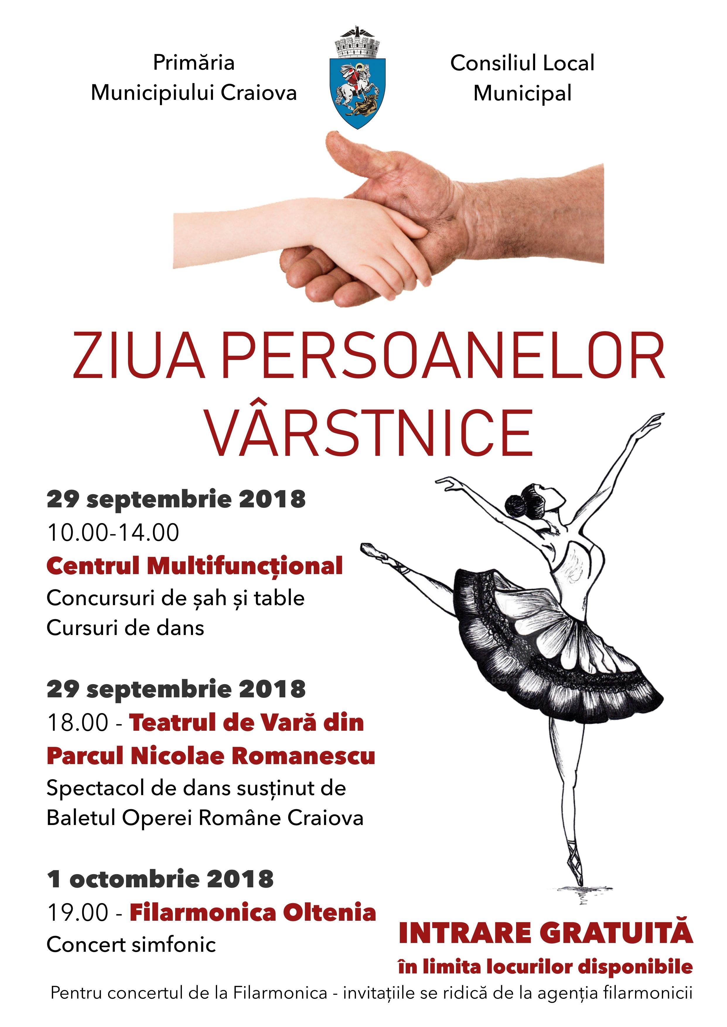 Sâmbătă, 29 septembrie, îi așteptăm pe seniorii Craiovei la Centrul Multifuncțional Craiova, între orele 10 – 14, pentru a participa la diverse concursuri dedicate acestora, pentru ca după-amiaza, începând cu ora 18.00, să îi invităm la un spectacol de balet oferit de artiștii Operei Române din Craiova, la Teatrul de Vară din Parcul Romanescu. Luni, pe 01 octombrie, Filarmonica Oltenia își deschide porțile și pentru persoanele vârstnice, la un concert special, în limita locurilor disponibile.