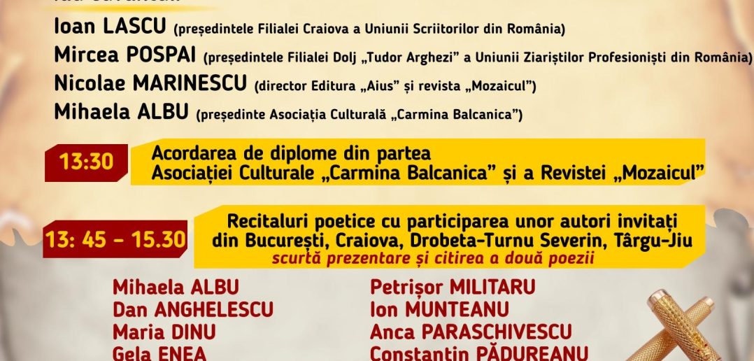 Ora 13.30 – Acordarea de diplome din partea Asociației Culturale „Carmina Balcanica” și a Revistei „Mozaicul”.